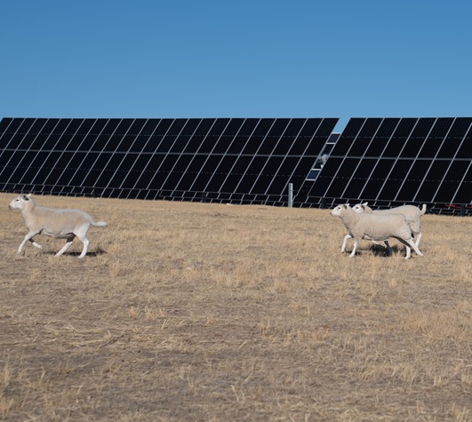 At Apex, we are leveraging solar resources and agriculture to work together, a management system called agrivoltaics. Here, we partner with a local rancher to graze sheep and llamas on-site. The animals help manage vegetation naturally, which reduces the need for mechanical mowing and improves soil nutrition. The sheep graze within the fenced area, and llamas act as their protectors. This partnership keeps the land healthy and active while the panels quietly produce local power.